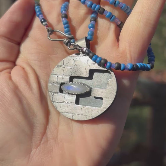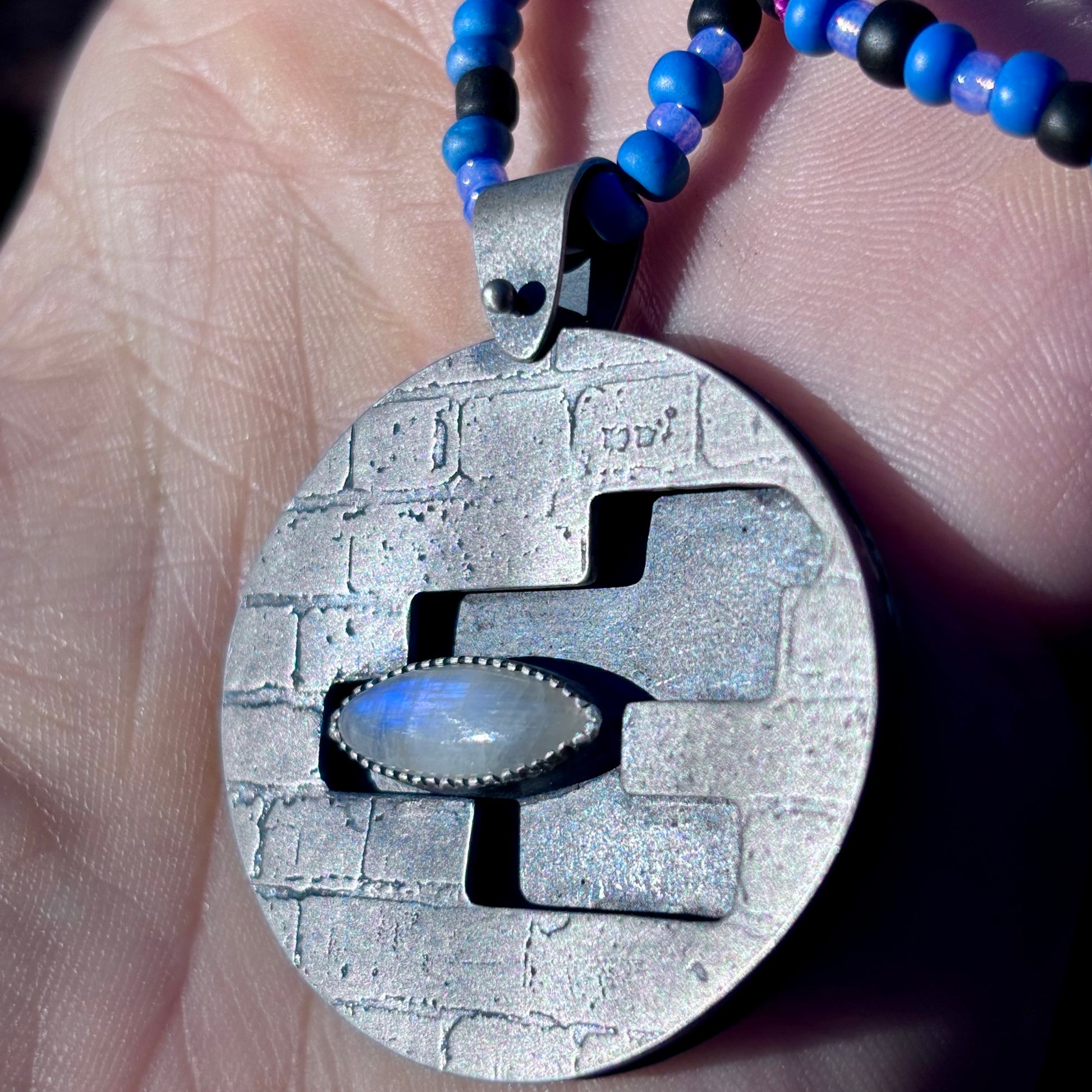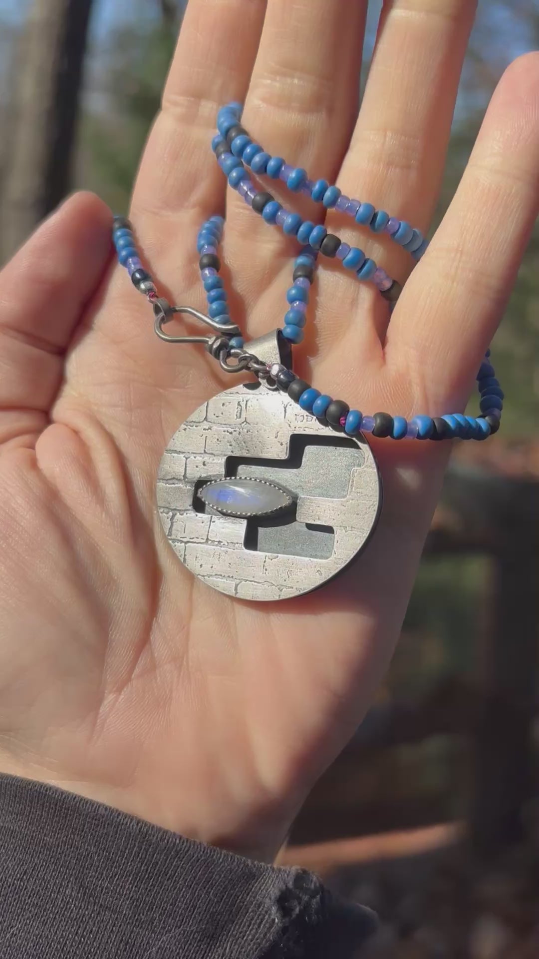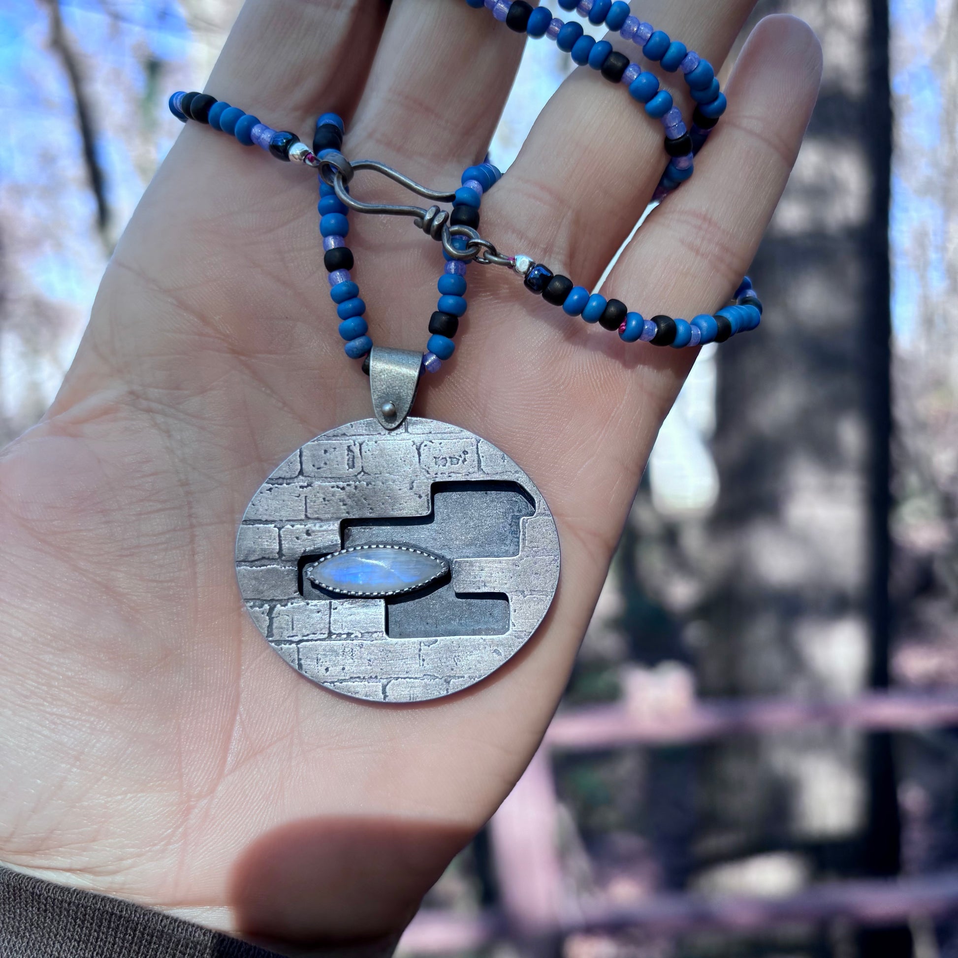 This one was tricky to photograph. I constructed this pendant from sterling silver that I etched with that brick pattern. And then I set a stunning piece of moonstone in the middle.