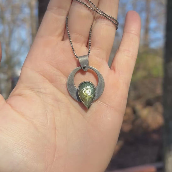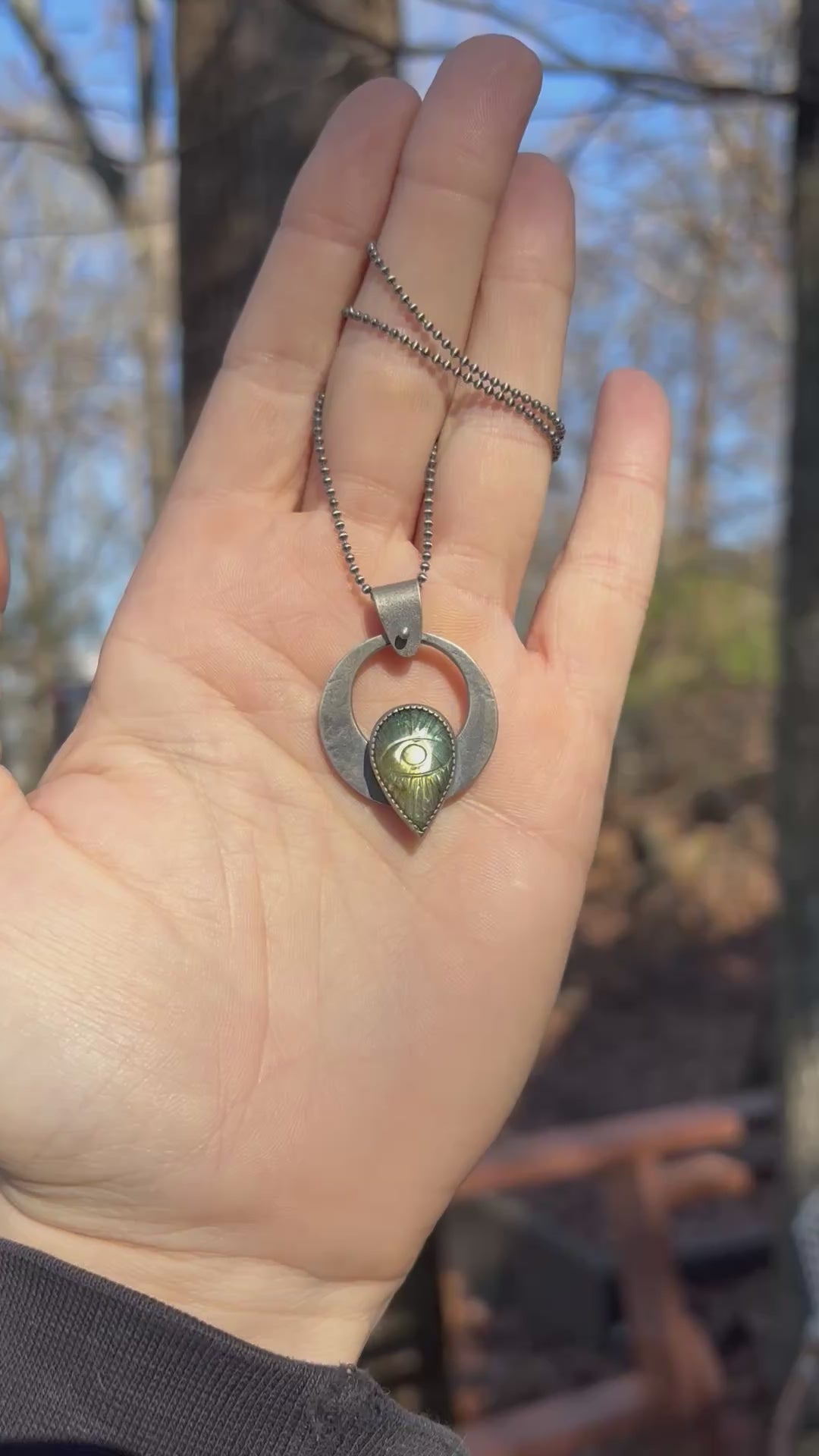 Who doesn’t need a bit of extra protection from negativity these days? This stunning pendant is fabricated from sterling silver. It is approximately 1.5 inches long. The flashy green/yellow piece of labradorite has had the eye hand carved into it.