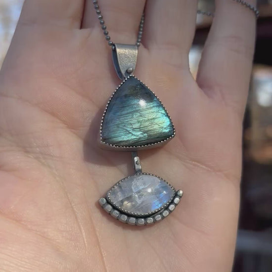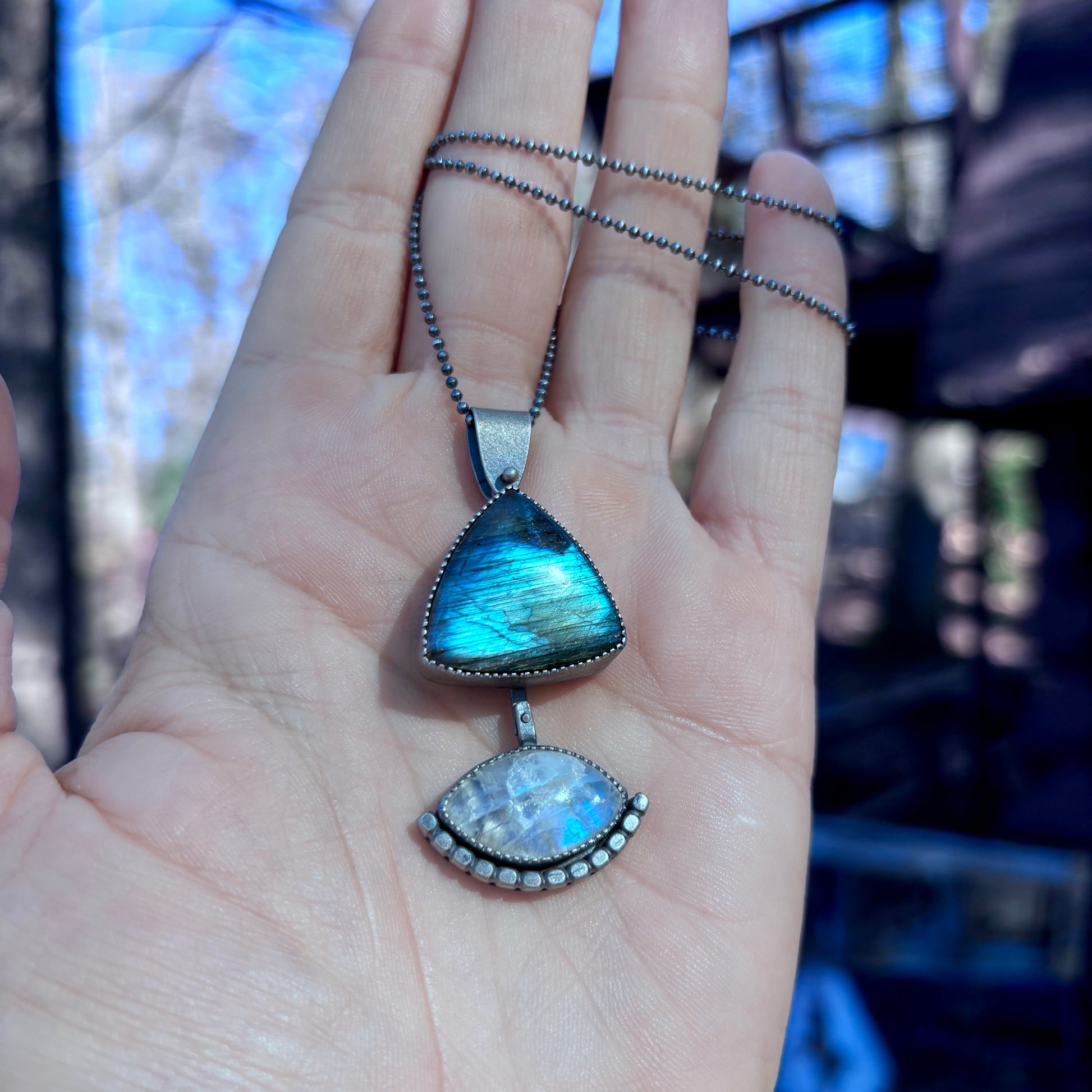 Who doesn’t need a bit of extra protection from negativity these days? This stunning pendant is fabricated from sterling silver. It is approximately 2.5 inches long. I have set a gorgeous blue flashy piece of labradorite above an moonstone eye.