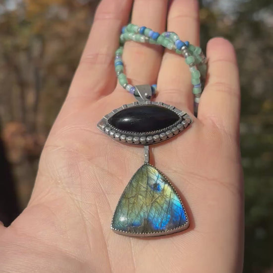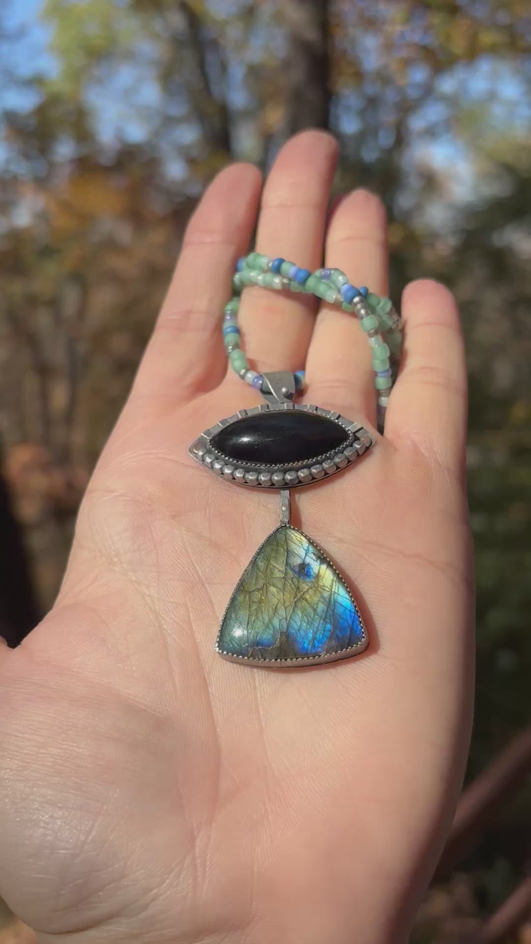 Who doesn’t need a bit of extra protection from negativity these days? This stunning pendant is fabricated from sterling silver. It is approximately 2.5 inches long. I have set a gorgeous blue flashy piece of labradorite underneath an onyx eye.