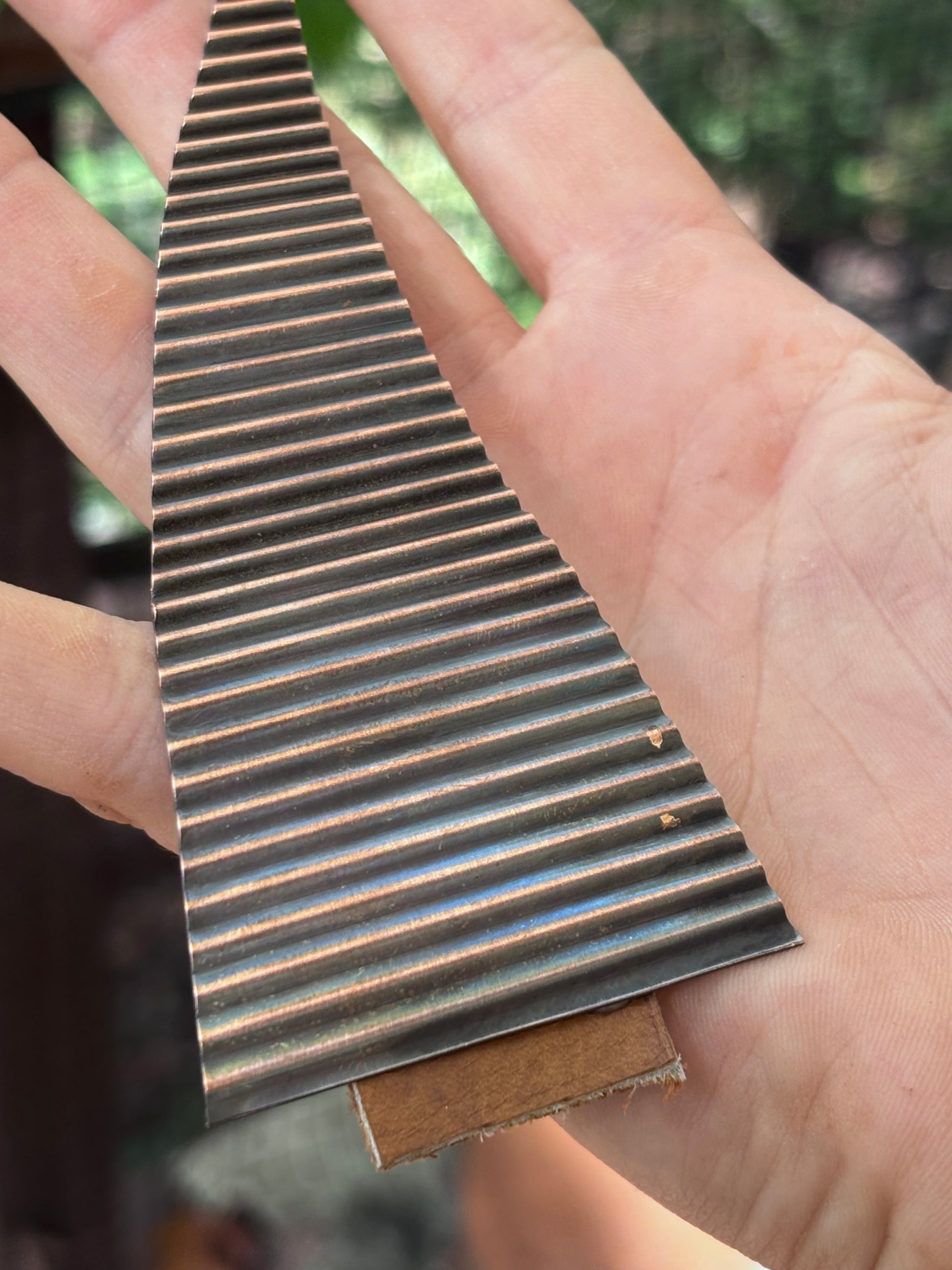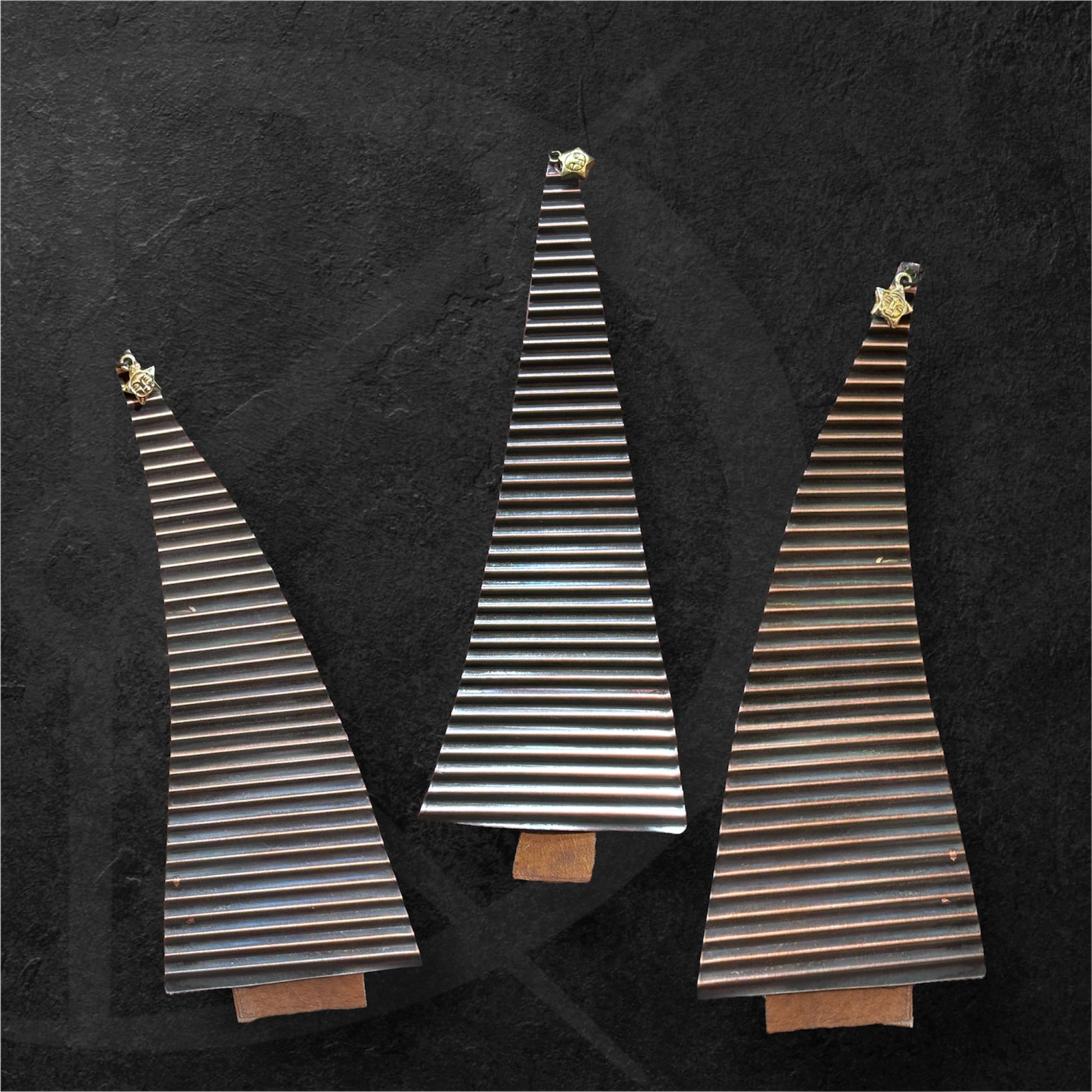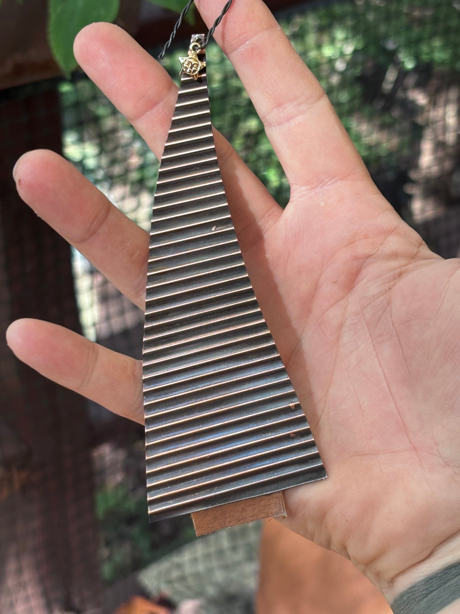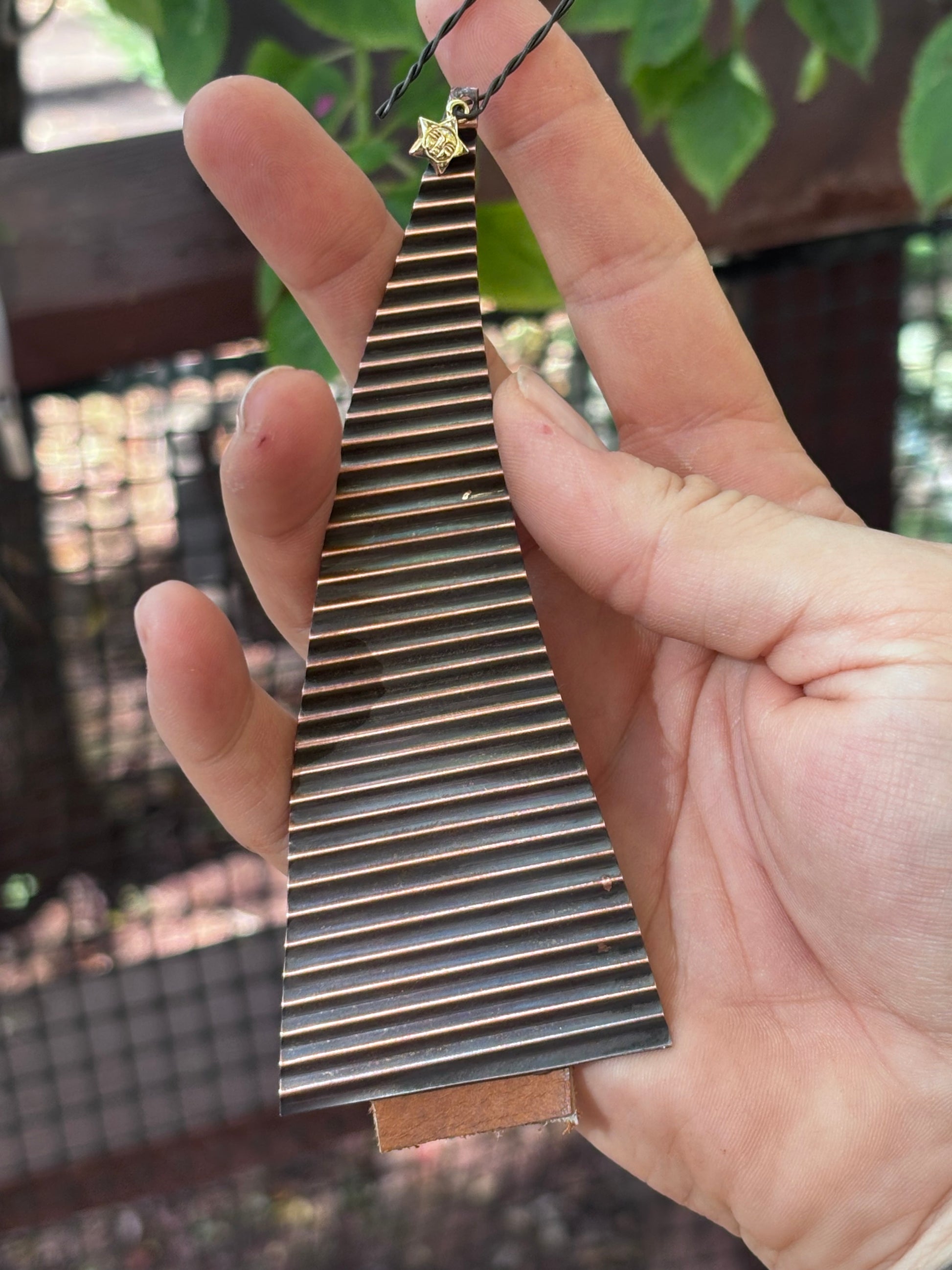 This year’s ornament is made from copper that I have corrugated and cut into the shape of a Christmas Tree. There is a brass star on top with a leather trunk at the base. They will come with a red ornament hook instead of the black one pictured here. I just got too excited about these and had to share them before the red wire arrived.