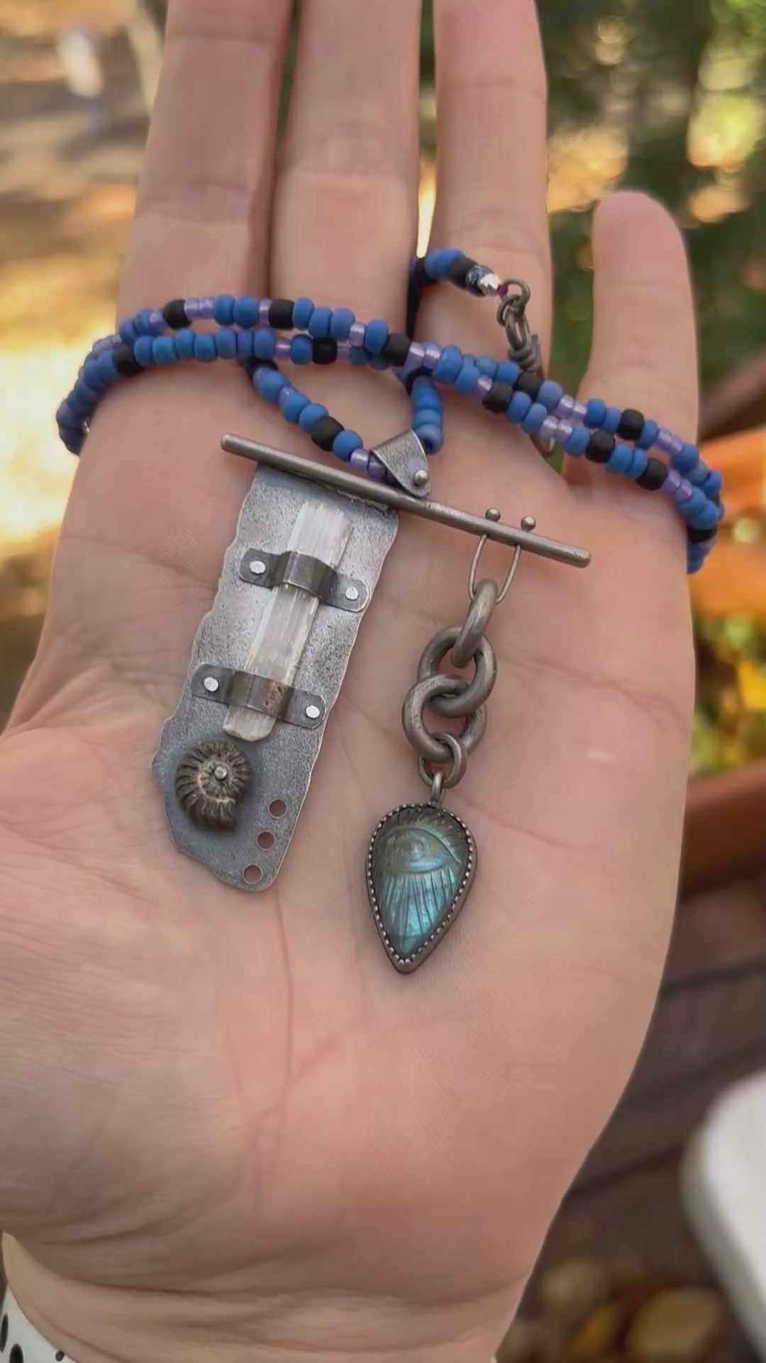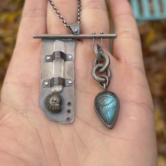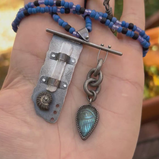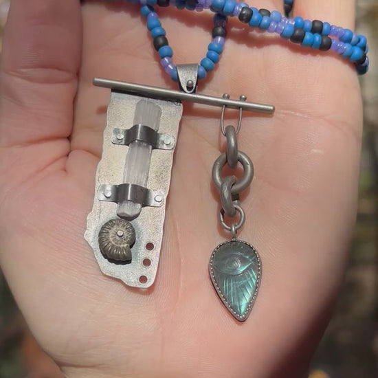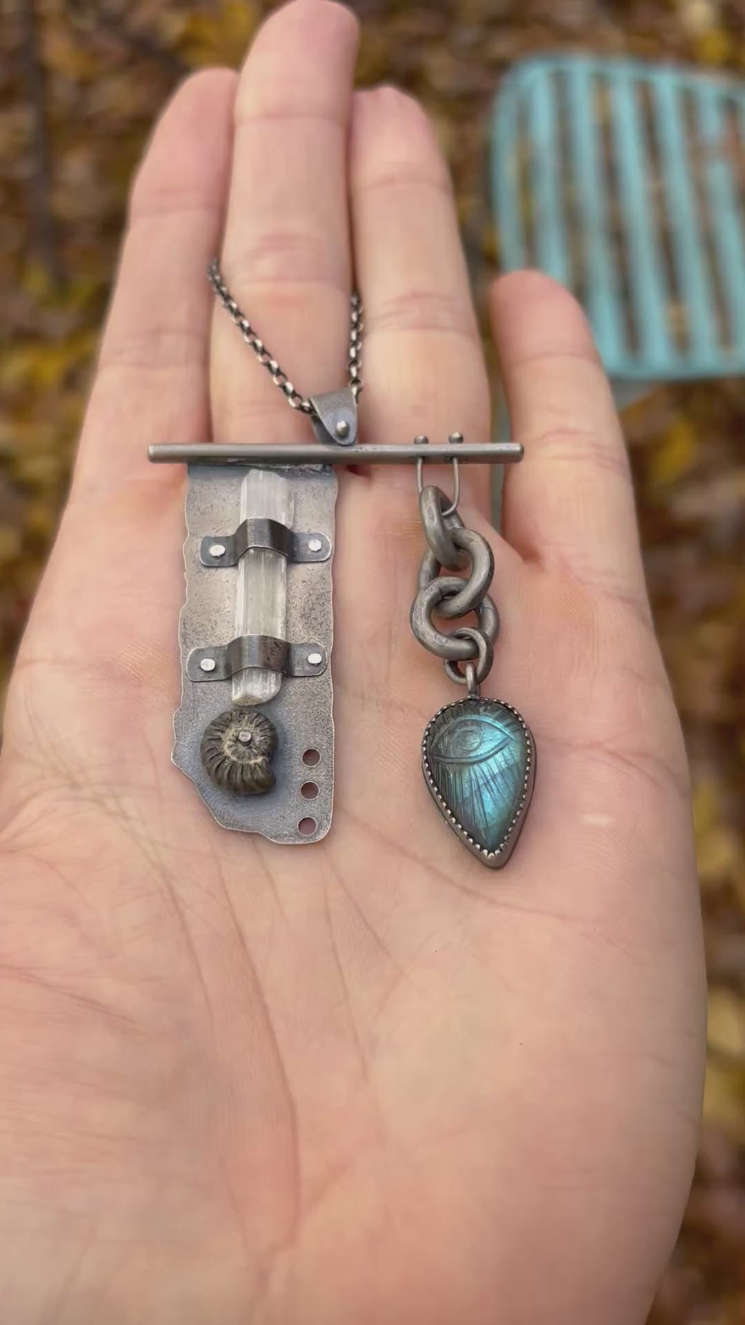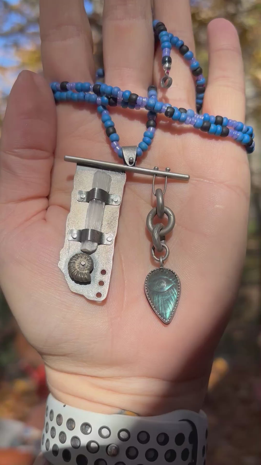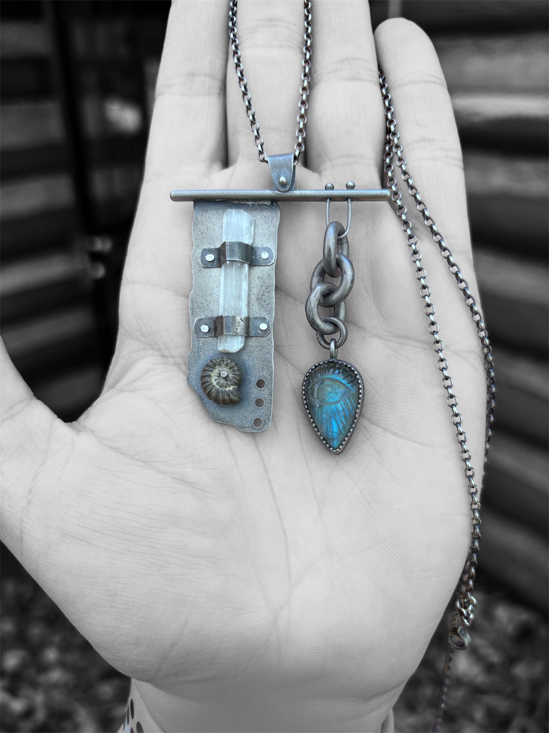 This sterling silver necklace contains a piece of labradorite with an eye of protection carved into it. Along with that I added a fossil of ammonite and a piece of selenite. This pendant reminds me of geology class and my brief week long desire to be an archeologist.